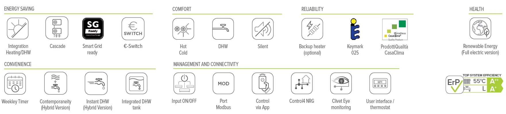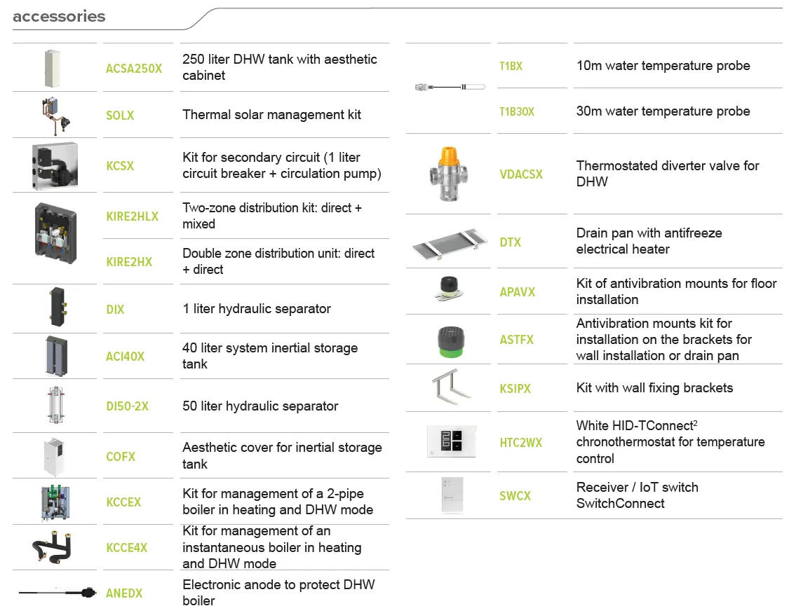Адаптирана е за различни нужди, благодарение на двойната версия с вградения 190-литров или 250-литров резервоар за битова гореща вода. Има система с функция за защита от бактерията легионела, благодарение на възможността за загряване до +65°C.